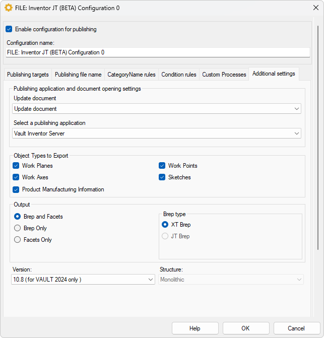 A new “Inventor JT” publishing module is available for files and items to publish Inventor models (ipt, iam) to the JT (Jupiter Tessellation) visualization format developed by Siemens PLM and used for the data exchange in, e.g., automotive or aircraft industry.