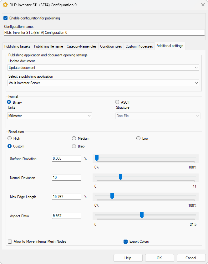 The same philosophy as in the Inventor STL File Save As Options dialogue windows is used.