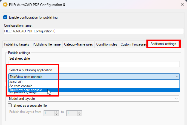 The option to publish "Sheet as a separate file" is automatically disabled when the TrueView core console is used because the DWG TrueView core console alters the alphabetical order of the sheets. This can cause issues when publishing custom layouts.
