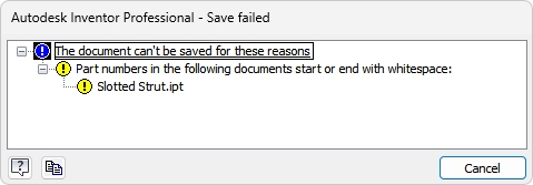 The iProperty Part number must not start or end with spaces, otherwise, the document cannot be saved. This rule applies not only to assemblies but also to parts.