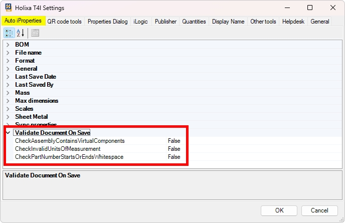 Be.Smart T4I -> Be.Smart T4I -> Advanced settings -> Auto iProperties -> Validate Document On Save