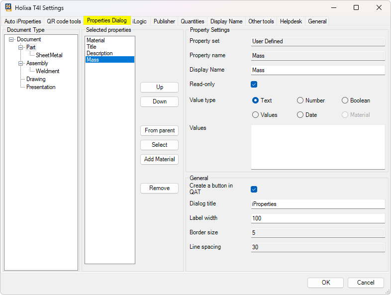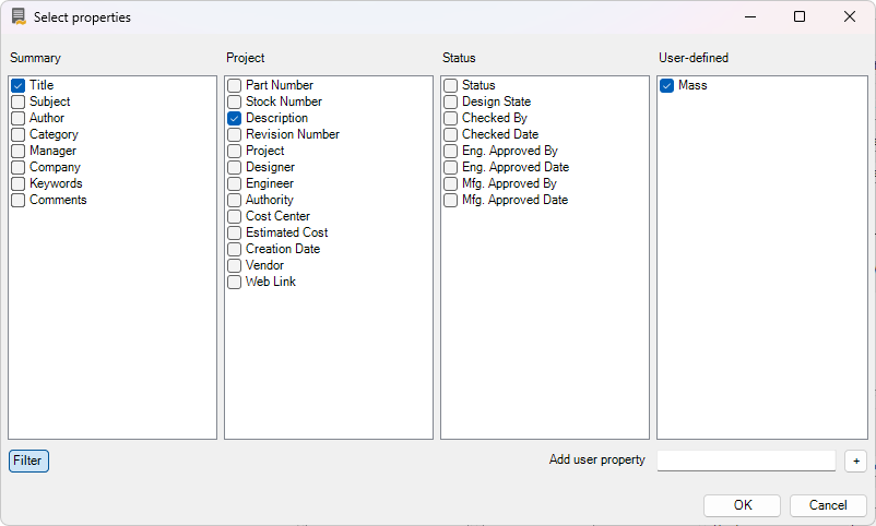 To learn about the Filter button of the Select Properties window (bottom left corner), see the page [Workflow overview (Automatic synchronization)](https://help.holixa.com/holixa-tools4inventor/commands-overview/edit-settings/auto-iproperties/synchronization-of-iproperties#workflow-overview-automatic-synchronization).&#x20;