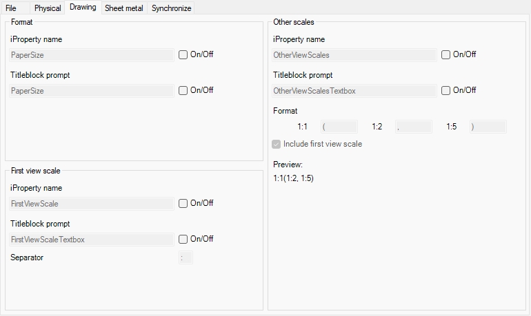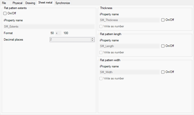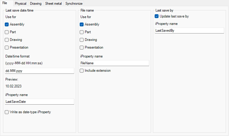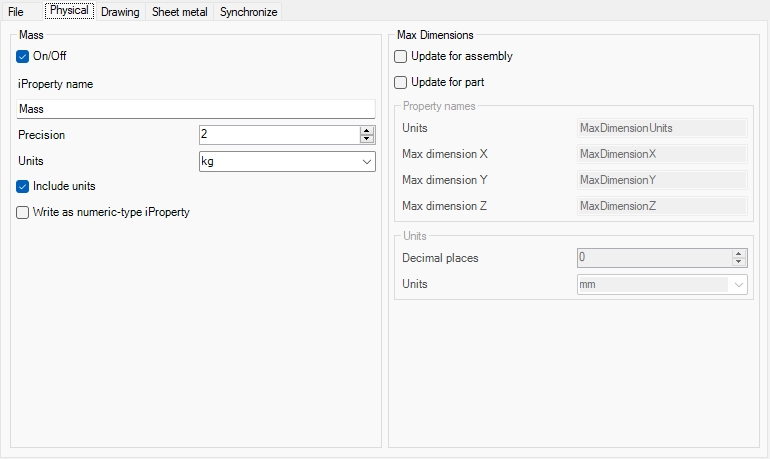 On tabs File, Physical, Drawing, and Sheet metal, select the desired iProperties that should be automatically updated in a document.