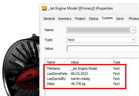 Given the specific settings for the assembly file depicted in the images above, four iProperties were automatically added to the document: Filename, LastSaveDate, LastSavedBy, and Mass.