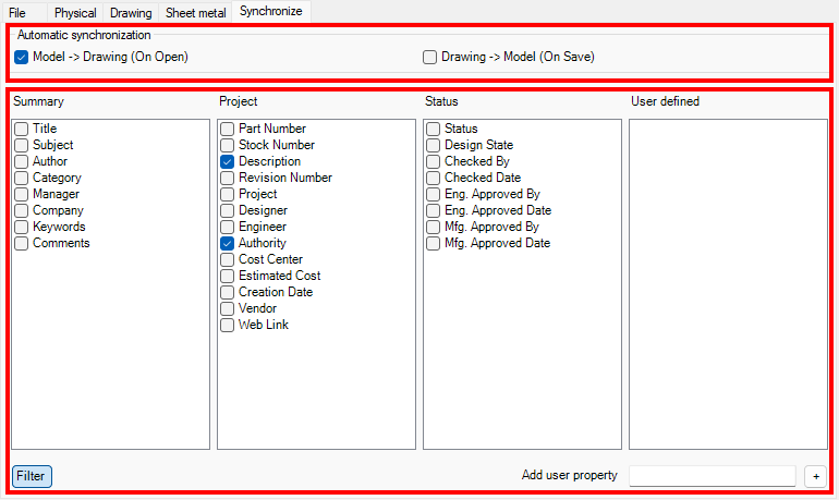 On the tab *Synchronize,* select iProperties to be synchronized between the model and drawing, and select the synchronization direction (from/to Model to/from Drawing). *On Open* means the iProperties are synchronized from the model to the drawing when the drawing is opened, whereas *On Save* means the model properties are updated after saving the drawing.