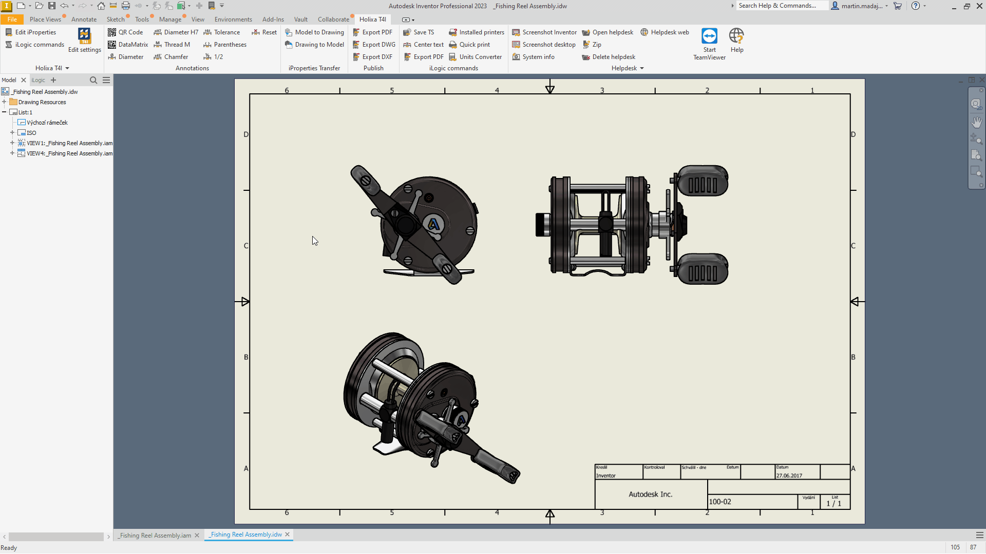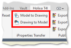 Moreover, changes to the iProperties of the model/drawing can be immediately projected to the respective file without waiting for the "automatic event" (e.g. opening the drawing). In such a case, *Model to Drawing* or *Drawing to Model* commands from `Holixa T4I -> iProperties Transfer` can be used.