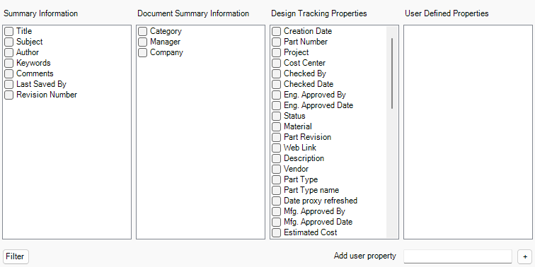 The Filter button at the bottom left corner of the window helps you to sort out the available properties into more convenient categories, like *Summary*-related, *Project*-related, or file *Status*-related. By default, this filter is turned on (the button is bluish). After disabling the filter, the properties are sorted differently into the following categories: (general) *Summary Information*, *Document Summary Information*, and *Design Tracking Properties*.