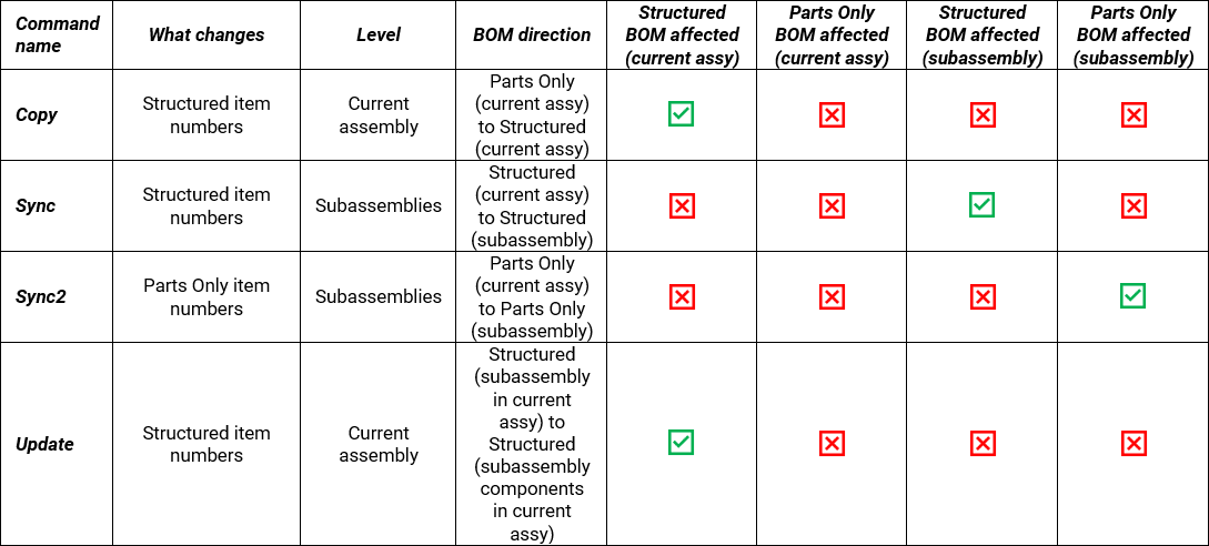 ### Summary of changes to the BOM performed by the command (a comparison matrix)
