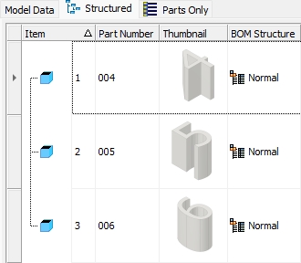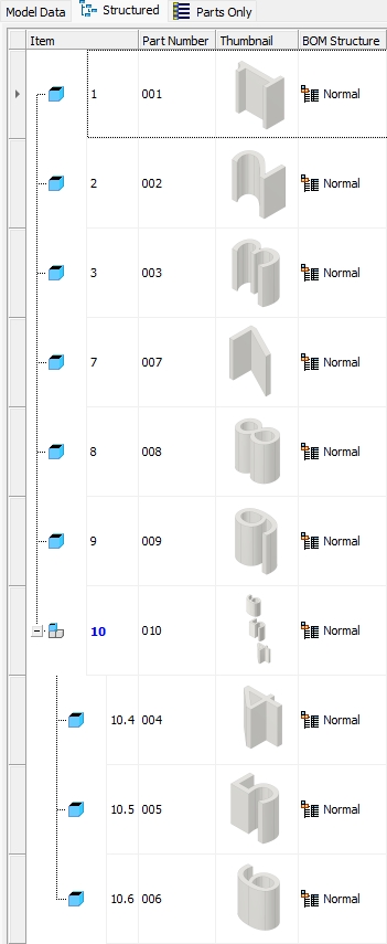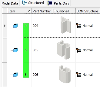In the Structured BOM of the main assembly, components 004, 005, and 006 have item numbers 4, 5, and 6 (after the dot symbol). Item numbers of components 004, 005, and 006 in the structured BOM view in subassembly 010 are 1, 2, and 3.