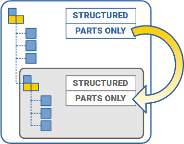 | Parts-only main assembly BOM before applying the command                                           | Parts-only subassembly BOM before applying the command                                                                      | Parts-only subassembly BOM after applying the command                                                                      |