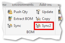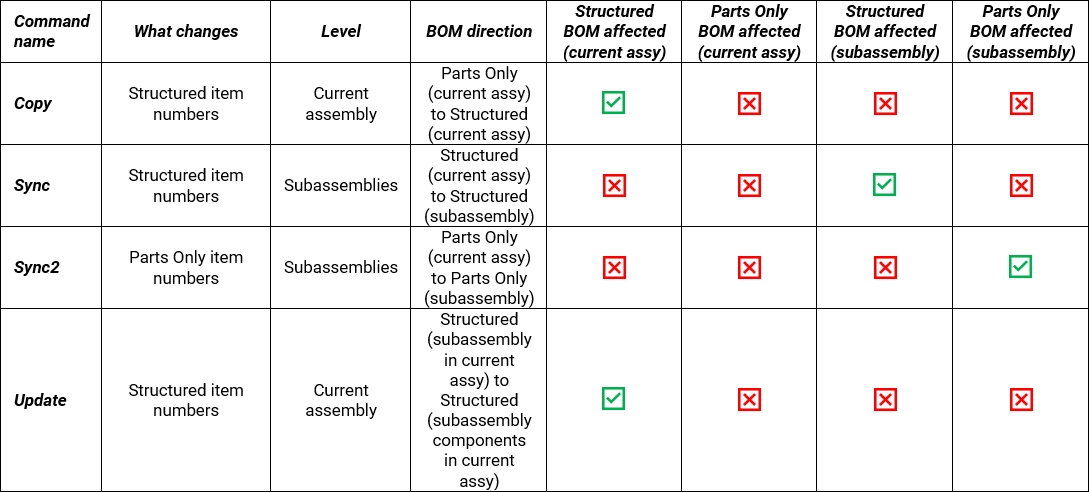 The Sync 2 command copies the item numbers of the Parts Only BOM view of the current (main) assembly to the Parts Only BOM view of the subassemblies.