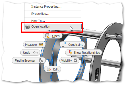 Based on the active selection, either in a model tree or directly on the component in a model window, this tool tries to open windows explorer with the corresponding file selected. The command is available only from the context menu.