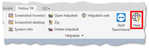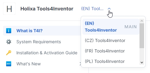 This command opens the online help web page of Be.Smart T4I at https://help.holixa.com/holixa-tools4inventor/. Users can select the help language version from the drop-down menu in the top left corner of the browser window.
