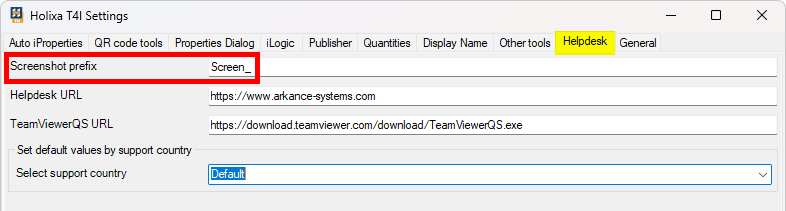 `Be.Smart T41 ribbon -> Be.Smart T4I -> Edit settings -> Helpdesk tab -> Screenshot prefix`.