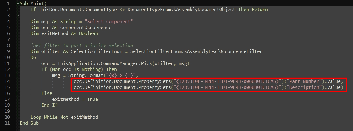This is a sample iLogic command. It provides iProperties-based information about the selected part in an assembly environment. Currently, the Part number and Description are reported when using this command.