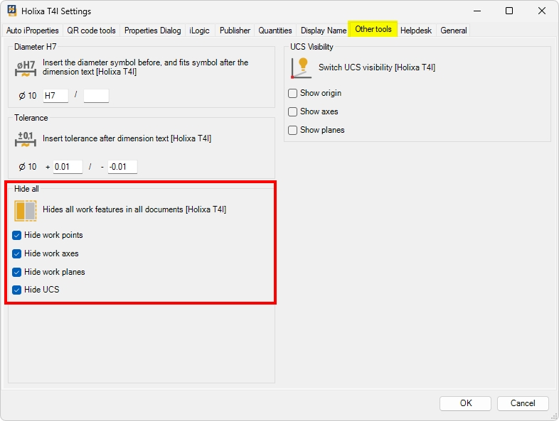 This tool hides all work features in the part or assembly and all dependent documents. Unlike the internal Inventor Object visibility command, it really sets the property Visibility to NO.