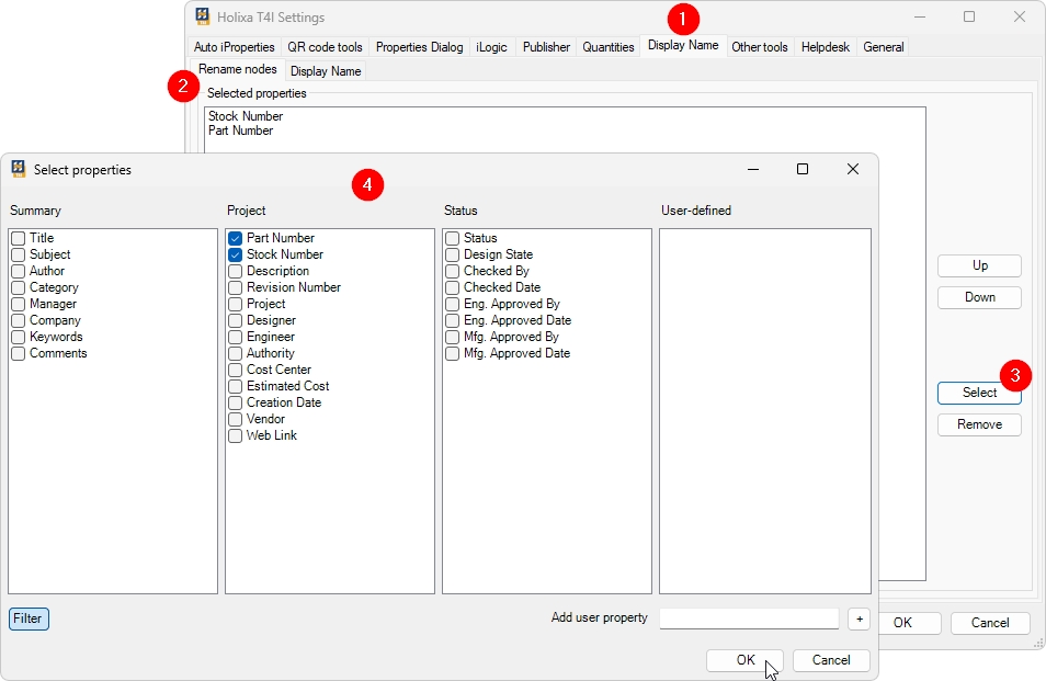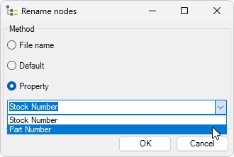 Setting up the Rename nodes command is very easy. If necessary, a user selects the iProperties that should be available for use in the Rename nodes command window, Property section.