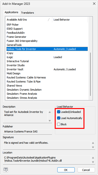 Should you, in rare cases, get the message about an add-in being blocked by Inventor, go to `Tools -> Add-Ins`, find the *Holixa: Tools for Inventor*, and check both *Load Automatically* and *Loaded/Unloaded* checkboxes.