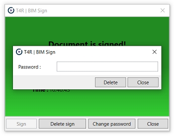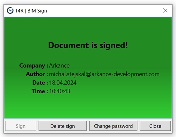 BIMsign does not prove an unmodified state of the original document (like digital signature does), it proves that a document is based on your original data. Non-authorized users cannot remove the BIM signature. The signature remains part of the BIM file even if the BIMsign utility is not installed on a Revit workstation.
