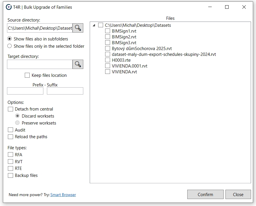 The function allows to batch upgrade Revit projects, families and templates to the current Revit version.