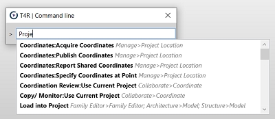 The function Command Line displays a simple input window where you can invoke Revit commands by typing their name or a part of their name. The autocomplete box lists all commands matching the typed substring, including any keyboard shortcut and the ribbon path. Try to enter, e.g. 'wall'.