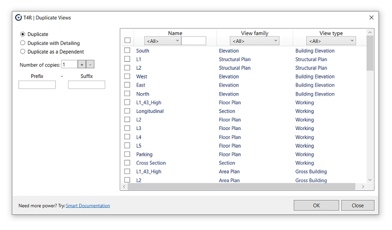 When creating new views, you can add your own prefix / suffix and define the number of copies. The tool can also easily filter the list of existing views from the project -by name, type and view typ