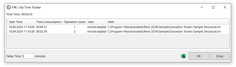* Net time in the individual Revit sessions (and timestamp of those sessions)