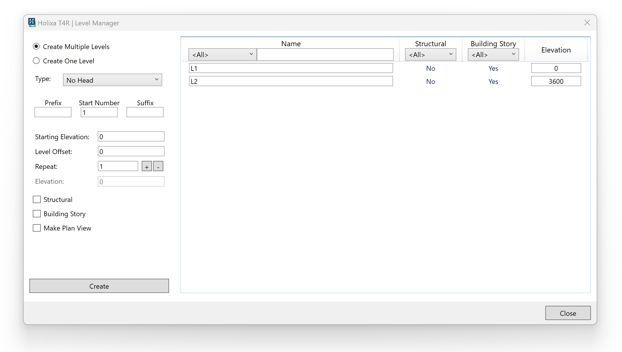 The Level Manager tool allows users to manage existing levels in a clear user interface, for example, to change level heights, delete levels, rename levels, or filter by properties and names. In addition to management, the tool also allows for the creation of new levels.&#x20;
