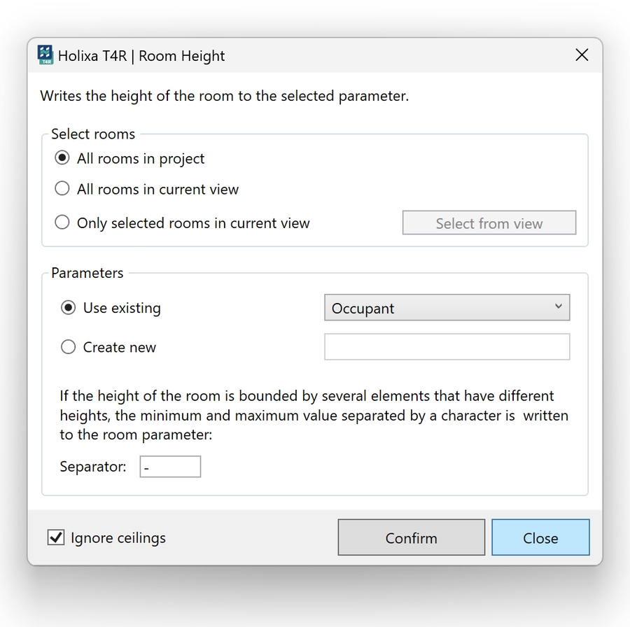 The feature Room Height automatically detects and writes the clear height to the selected room parameter. If the room height is delimited by multiple elements with different heights, minimum and maximum height is written to the parameter.