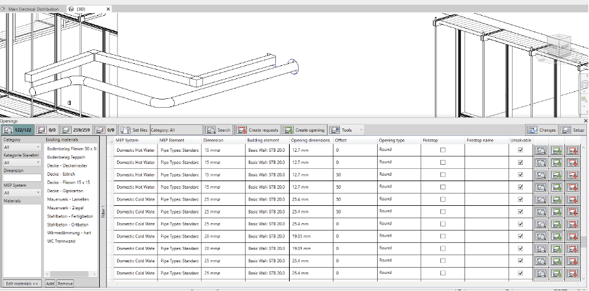 The architect gets a table report inside Revit, plus in the classic 2D and 3D Revit views. After they check the requests, all or some of the requests can be used to generate openings automatically. This tool offers wide customization options and allows o.a. filtering of colision elements by material, attaching information about fire inserts, or attaching comments displayable by other team members.