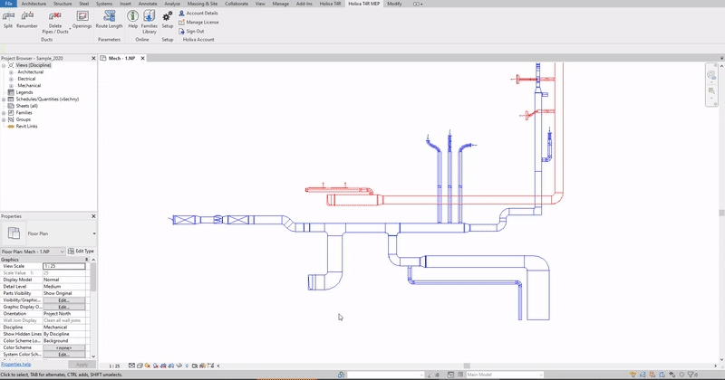 Select several ducts / pipes from the model and run the Route Length command. The tool displays the total length of the selected route.