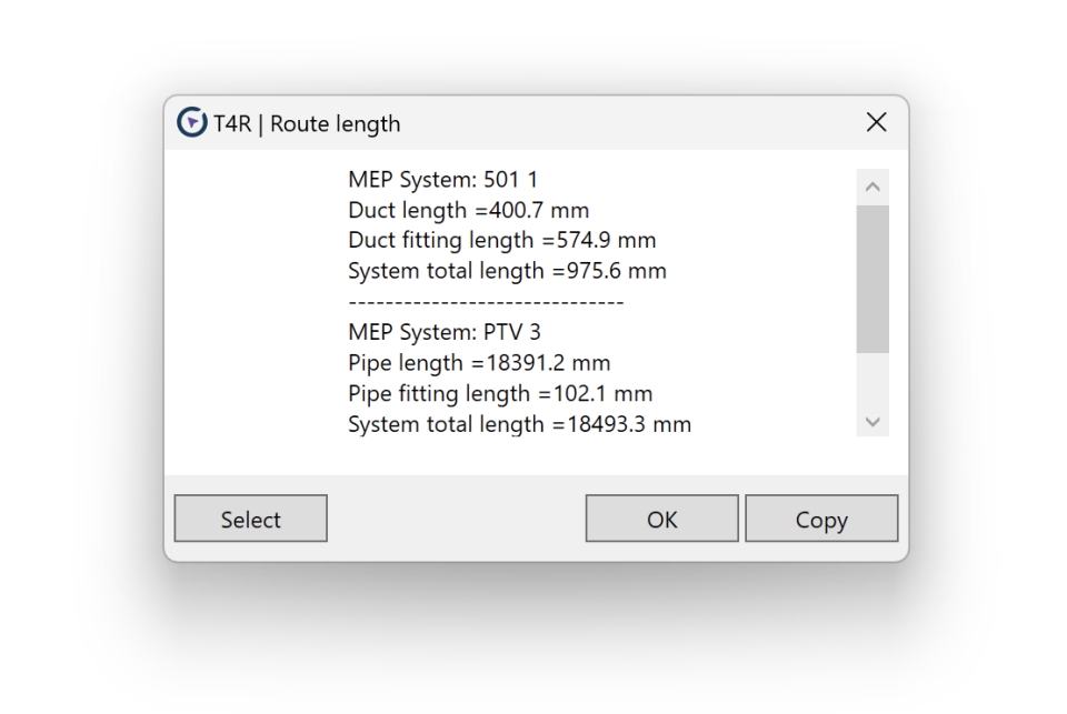 • When selecting multiple systems it gives you: the total length of selected, the total length of different systems and the length of straight elements and fittings within different systems.